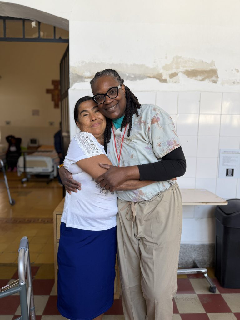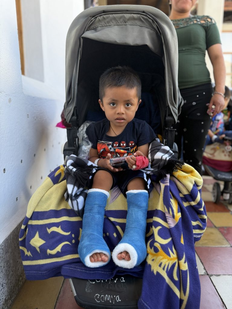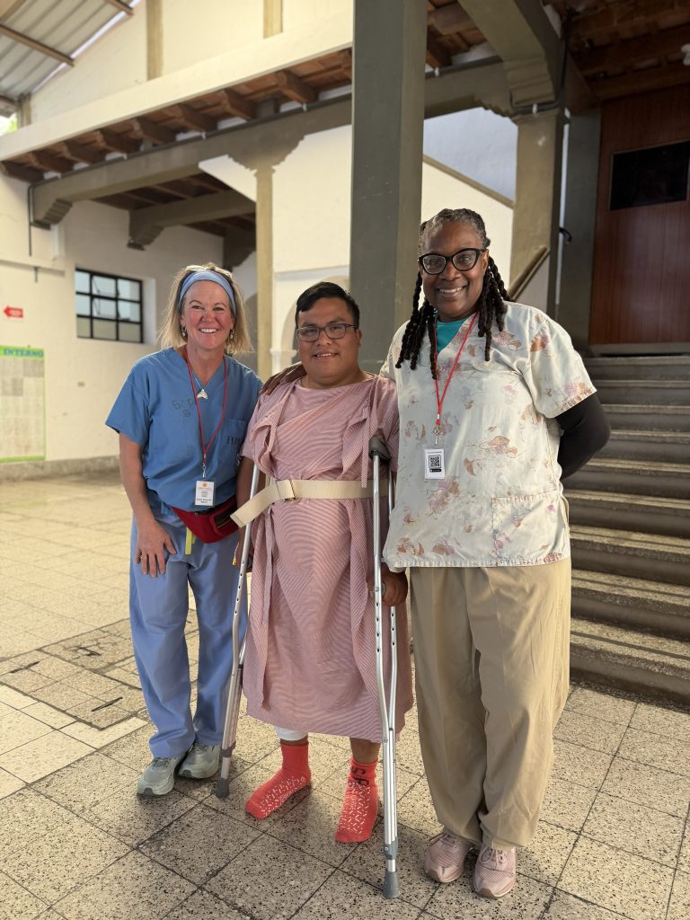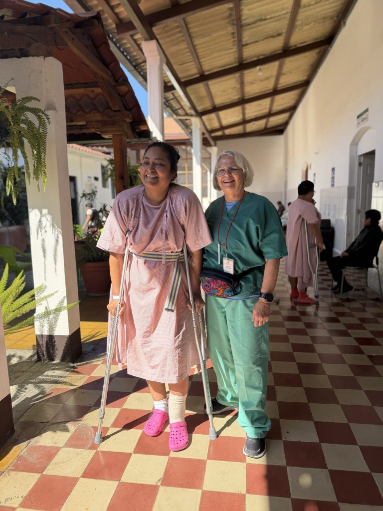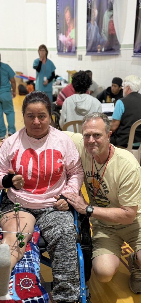 This morning in our mobility clinic, a woman arrived with pins sticking out of her leg from a procedure she’d had done elsewhere. The team got creative as they came up with a solution to help support and stabilize her leg in an erect position. Upon understanding her need, Jeff McHugh quickly got to work thinking through the options based on the materials available down here. He built a custom extension on which she can rest her leg. Upon helping to assemble her new “custom ride” both Jeff and the patient were emotional as she expressed her sincere gratitude for the incredible love she was shown. Our theme this week was written across both of their faces as well as on the patient’s shirt which read “LOVE”!