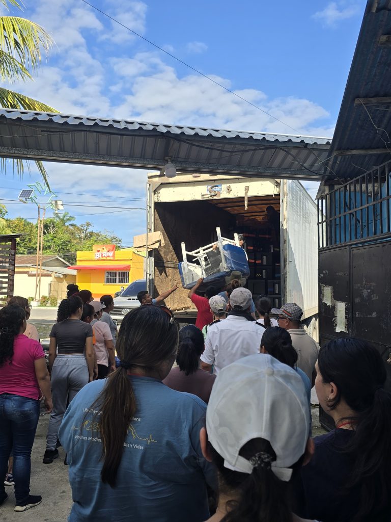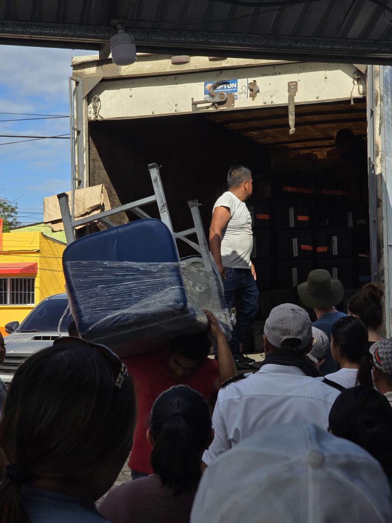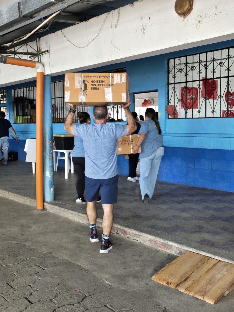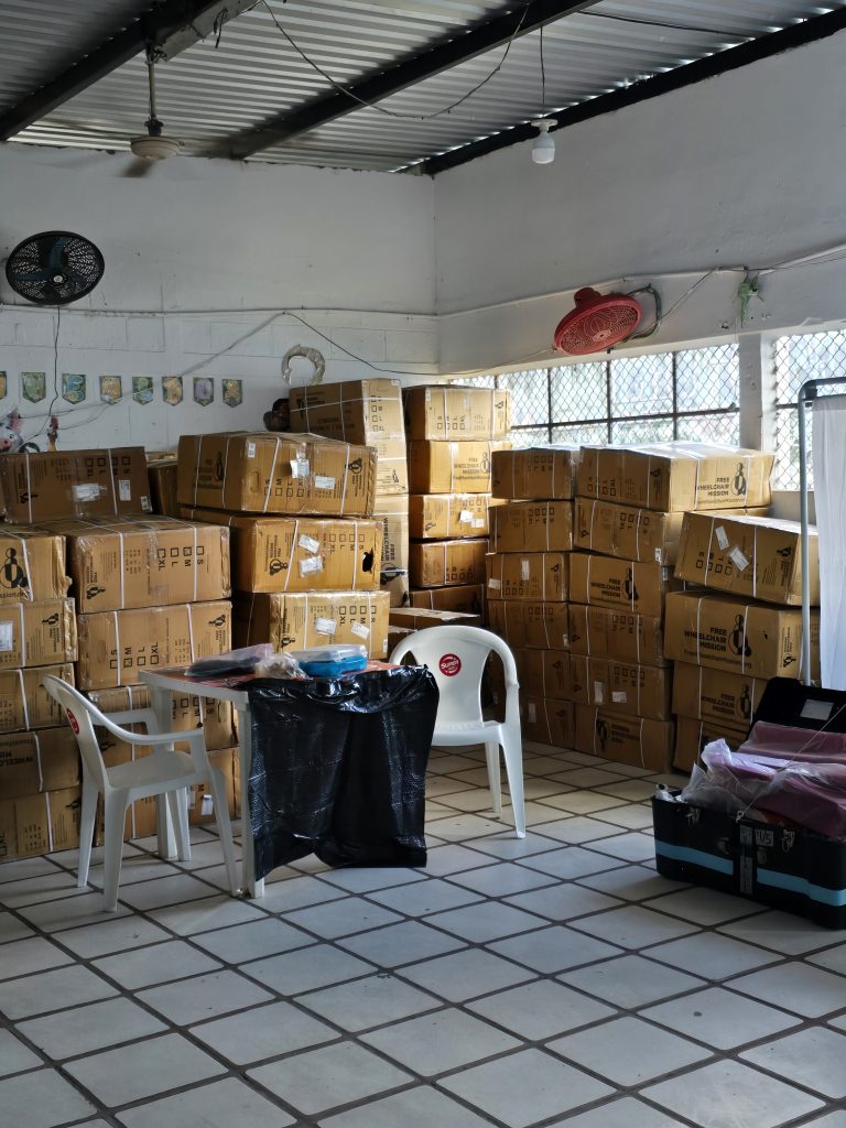 A large truck was backed into a side entrance gate, packed to the rafters with all the gear, equipment and supplies necessary to set up and supply the clinic for the week. It is hard to adequately describe just how much stuff was on the truck! All of us, along with all the Red Hats, queued up and started unloading what seemed like a never-ending stream of crates and boxes of supplies, equipment…. And wheelchairs… So many wheelchairs!