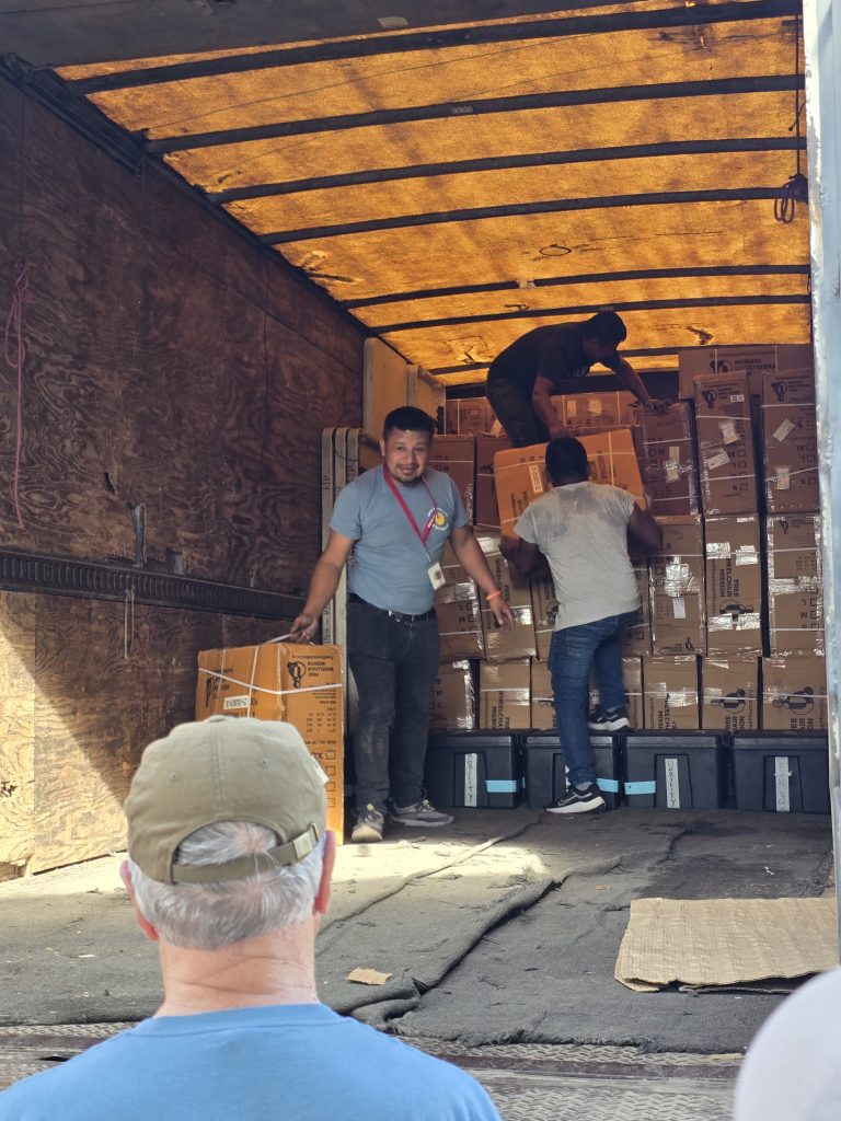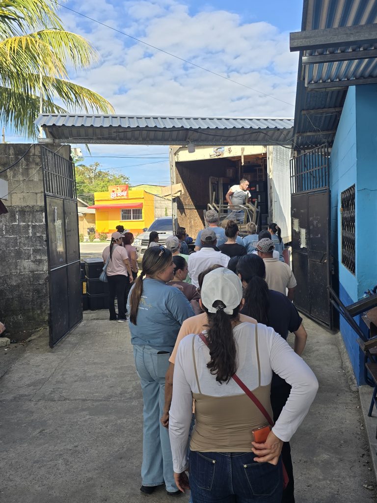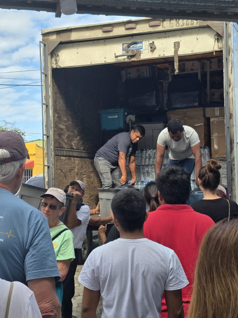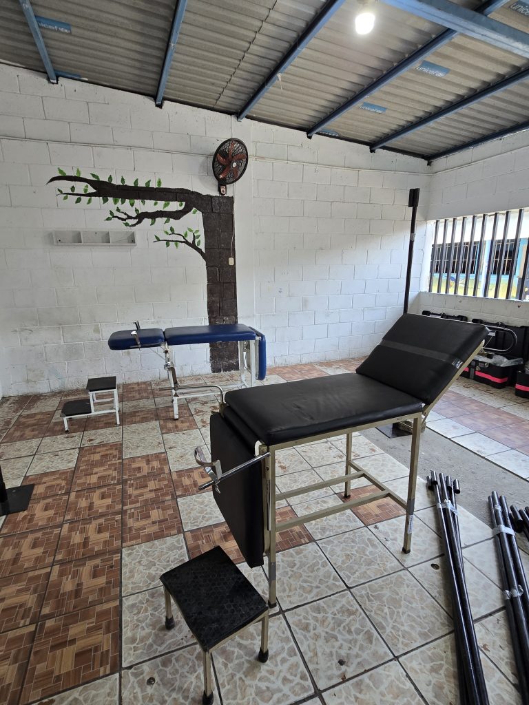 A large truck was backed into a side entrance gate, packed to the rafters with all the gear, equipment and supplies necessary to set up and supply the clinic for the week. It is hard to adequately describe just how much stuff was on the truck! All of us, along with all the Red Hats, queued up and started unloading what seemed like a never-ending stream of crates and boxes of supplies, equipment…. And wheelchairs… So many wheelchairs!