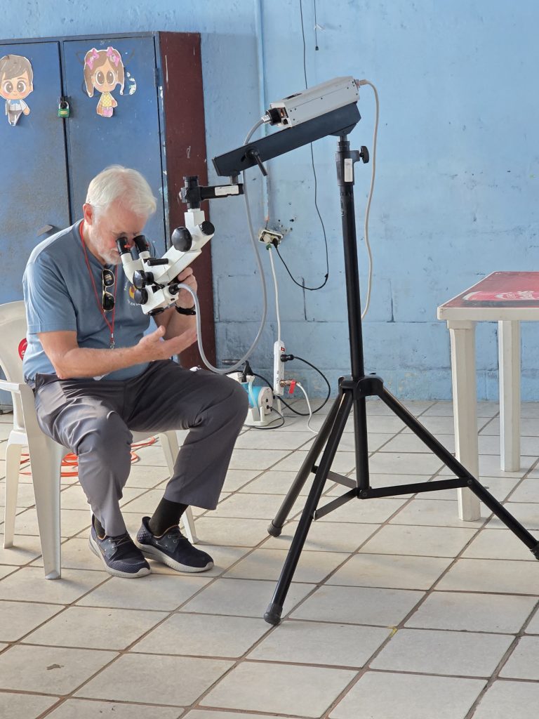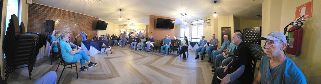 As we filed into the school, we were met in the courtyard by about 50 people. These were the local people who had been and would be working with us: the “Blue Hats” who had been spreading the word throughout the area of our pending arrival, identifying candidates, evaluating needs and setting up appointment dates, and the “Red Hats”, 40 people who would be assisting us throughout our time here, checking in patients, answering their questions about process and helping them navigate from intake, through triage, and to the appropriate stations and specialties as warranted by the individual reasons for their visit.
