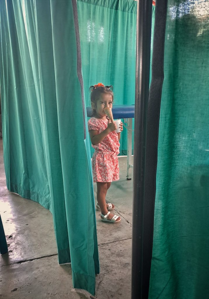 I am distracted by a little girl in orange in the clinic next door, I invite myself into ENT to meet Marjorie, she is 4 and doing just fine. She is accompanying her mother to her visit, the ice cream may be a bribe, or maybe that is my jaded first-world aunt perspective. Maria (mom) hit her head 13 years ago and ever since she has been getting ear infections periodically, ENT identifies a tympanic membrane perforation that has never healed and refers her for a surgery that will fix the long standing problem for good. I’m sure Marjorie would be very happy for her mom if she knew of the discomfort she has been handling for a long time.