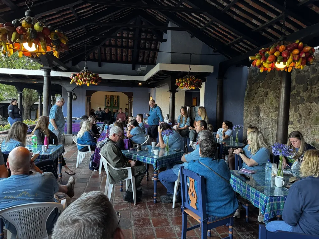 Our day began with sunrise and a poolside workout. Fuego, one of the active volcanoes, was puffing smoke in the distance.  Coffee was brewing, and bacon was cooking. The sweet taste and smell of morning. The Lord is at work. One team member was moved to be baptized this morning. It was a poignant reminder of God’s work, cleansing us from sin and separation—a true joy to watch.